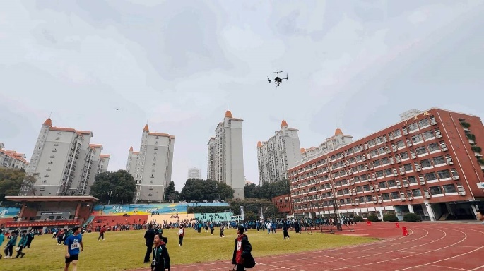 最为激动人心的环节当属无人机飞行演示。无人机在学校操场上空盘旋、飞行,其稳定的姿态和精准的控制引得在场学生阵阵欢呼。飞行展示不仅是一场视觉盛宴,更是一次生动的科普教学,激发了学生们对智能感知、自主导航等技术的浓厚兴趣。现场展示的“安巡卫士”智能巡检机器人以其独特的设计和功能吸引了众多学生驻足观看。