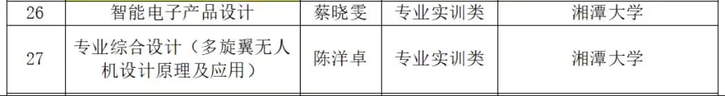 陈洋卓副教授主编申报的《专业综合设计(多旋翼无人机设计原理及应用)》和蔡晓雯副教授主编申报的《智能电子产品设计》两门课程获批湖南省创业精品课。